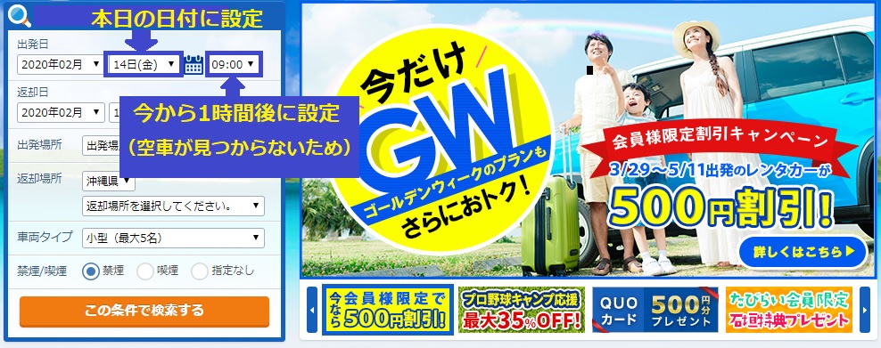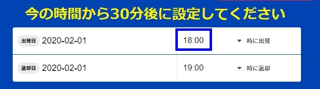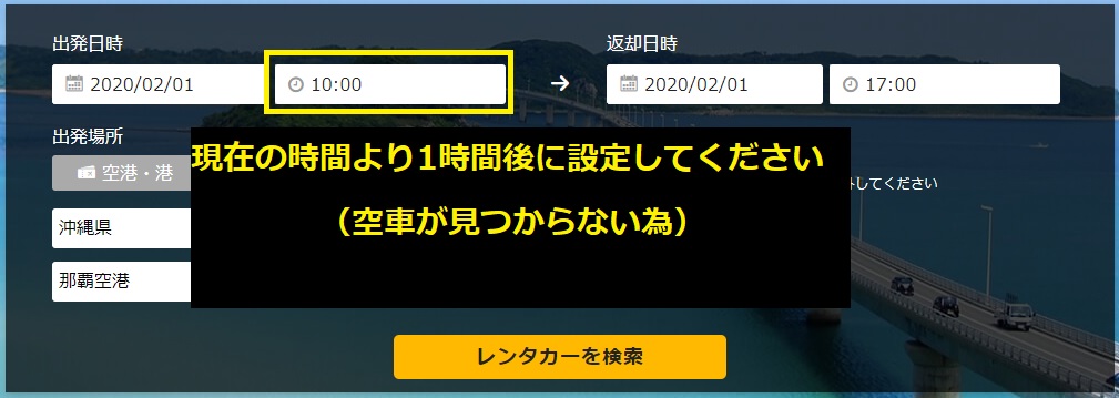 予約するときは、現在の時間から1時間後以降(スカイレンタカーは30分後)に設定してください。